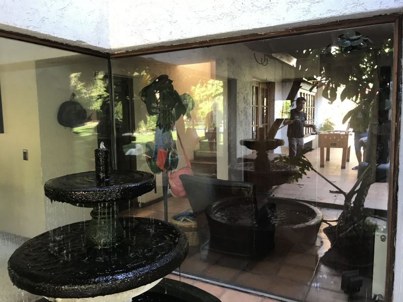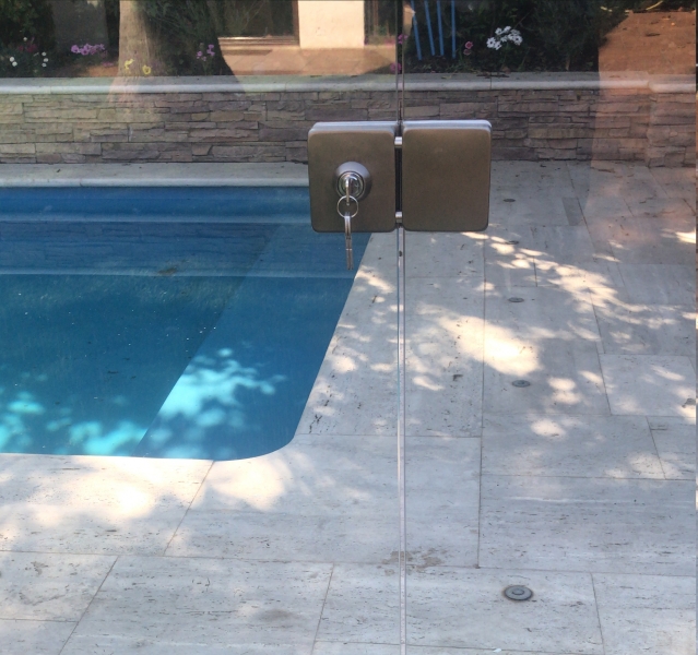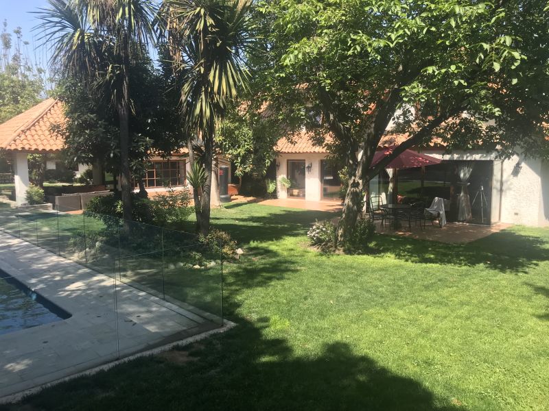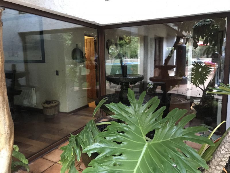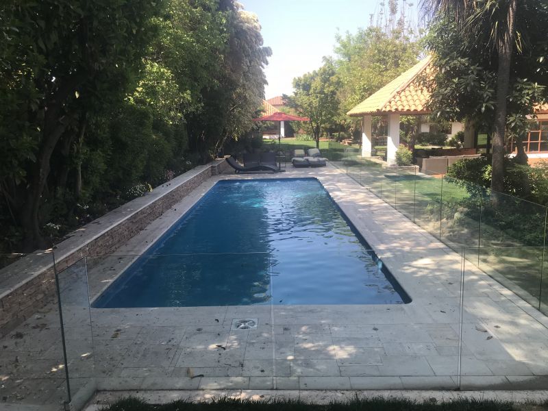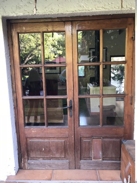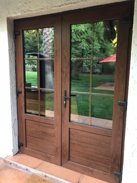 Ventanas de PVC Nogal. Línea europea con termopanel Blindex® (seguridad) y termopanel con palillaje. Puertas de cristales con cerradura inoxidable para cierre de piscina.